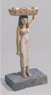 どこか見知らぬ土地で、ふと道すがら、こんな少女の姿に目がとまった、といった風情がある。頭上の籠に焼きあがったパンか何かを載せて、いまどこかへ運んでいるところだろう。(中略)何の装身具も身につけていないが、両前肩に垂れる房々とした黒髪、くま取りが少々きついが、整った顔立ち、美しい姿態。特に興味深いのは、彼女が身にまとっている衣類である。右乳房を露わに、左肩だけで吊っている。 『「大英博物館展―芸術と人間」図録』より (連載第17回) |