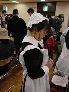 話が渡辺さんを置いてきぼりにして、どんどんどうでもいい方向にずれていきますね。自分でも読み返して意味不明になってきました。いろいろ変なことを言ってますが、なかなか面白いイベントでした。いろいろな意味で。メイドさんのコスプレの方が多いのは嬉しいのですが、やはり自分の嗜好が偏っていることを認識させられました。スカートは長い方がいいと思うし、キャップもカチューシャに劣らないと思うんですが。 あ、そうそう、最大の成果は渡辺さんの意外な趣味が判明した点でした。写真を御覧になればお気づきかと思いますが、何枚もメイドさんがスカートをひろげてしゃがむポーズを撮ってますね。うーん、渡辺さんはこの恰好が好きだったのか(渡辺注・・・否定はしませんが、何となくああいったポーズを撮影するのがお約束のような気がしたので)。いや、悪いとは全く思ってませんよ。だってスカートが長くないとこの構図が取れないから。