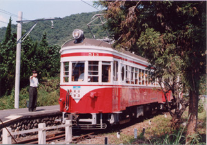 (北野畑駅にて2001年9月26日撮影)この電車は数年前まで揖斐線や谷汲線というところを走っていましたが、一旦引退して予備車になり、2001年9月いっぱいで谷汲線が廃線になるときに一時さよなら運転をやっていましたが、その後活躍の場を失っていたところ、今年2003年が登場77周年記念ということで、美濃町線というところ(『電車でGo』の舞台にもなったので、ご存知の方もいるかと思います)で週末に復活運転ということになったのでした。余談ですが、筆者が谷汲線を最後に看取りに行ったのはその年の9月26日でしたが、これは奇しくも日野橋ブロンズパロット閉店のちょうど一年後でした。別段日付を合わせて行ったわけでもないのですが。